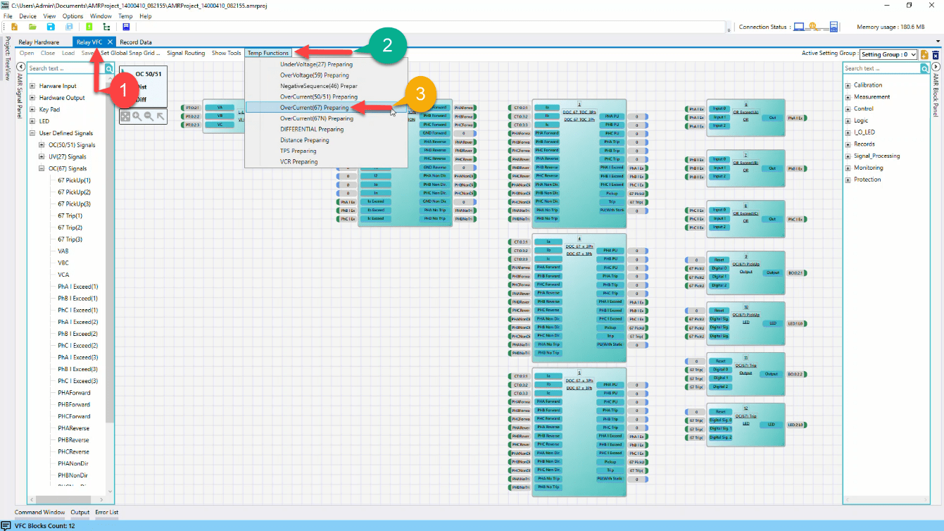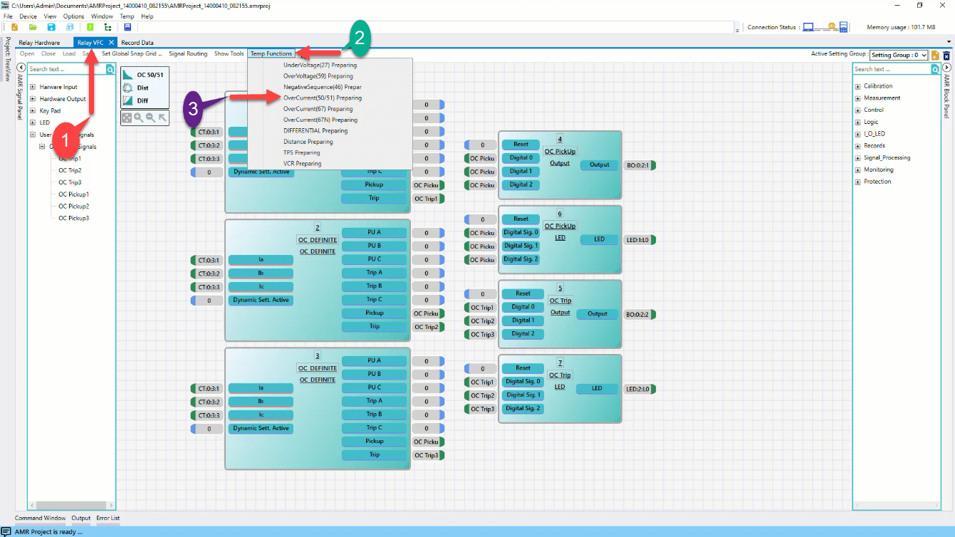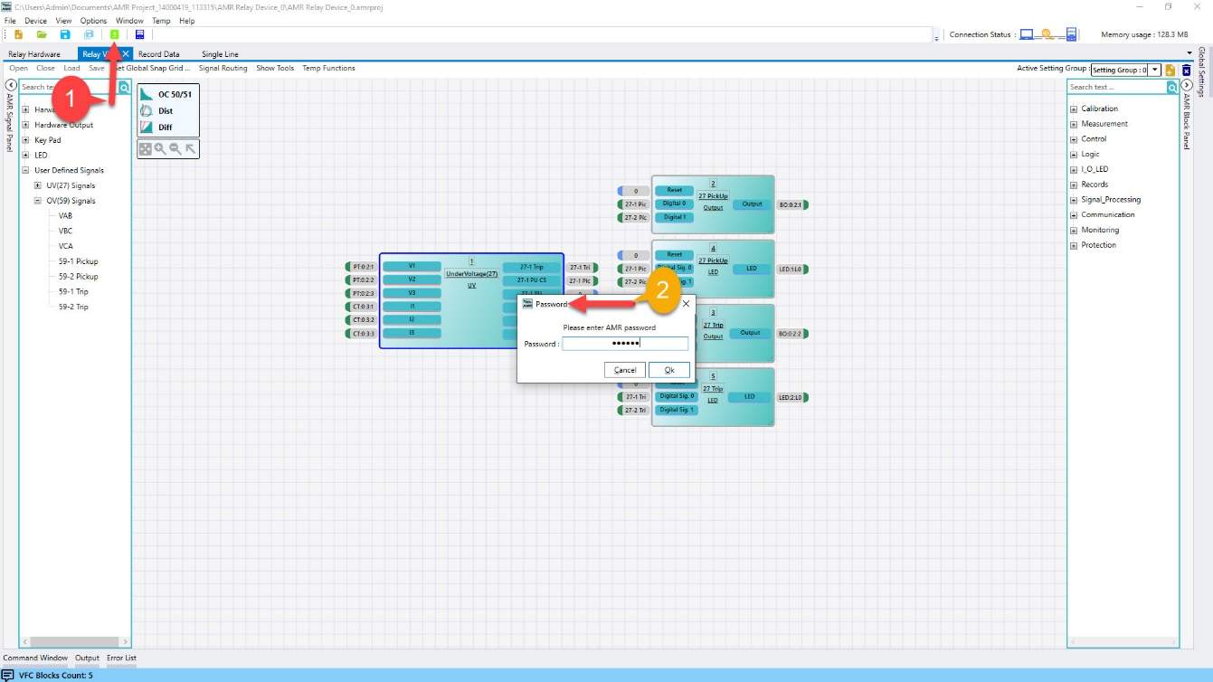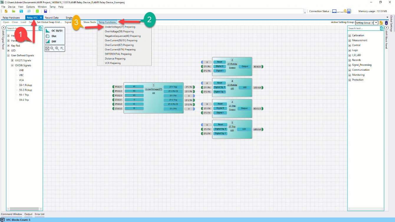 در صورتی که با نرم افزار رله کار می کنید میتوانید مطابق شماره گذاری انجام شده روی شکل زیر، با رفتن به زبانه Relay VFC و انتخاب فانکشن مورد نظر که در این آزمایش، OverCurrent است،یک تمپلیت پیش فرض را لود کنید. و تنظیمات مدنظر خود را با دابل کلیک کردن روی بلوک مربوطه، اعمال کنید.