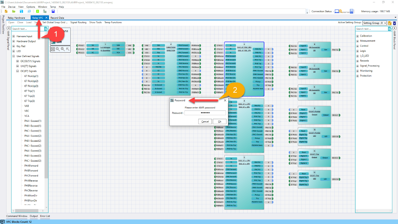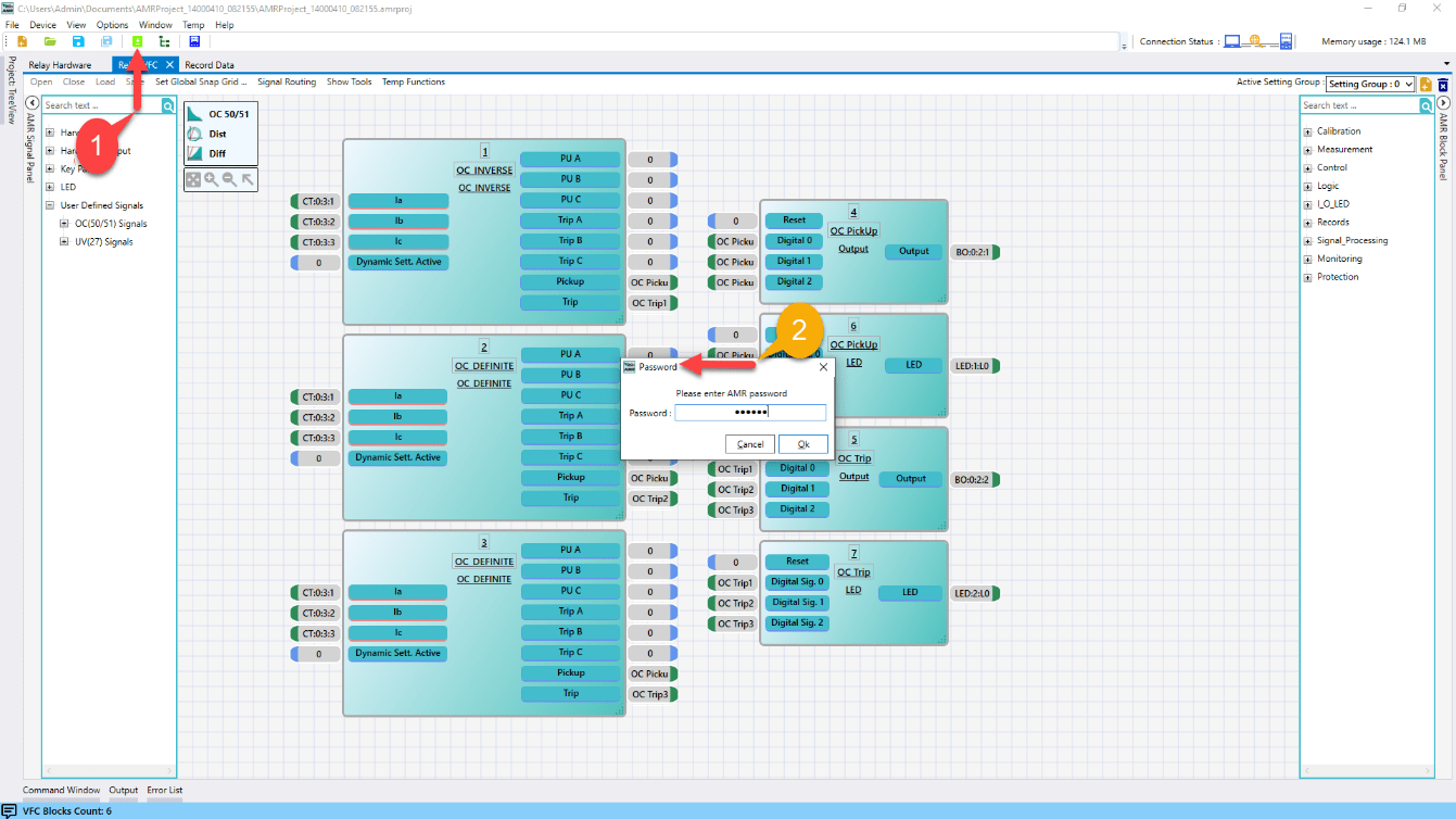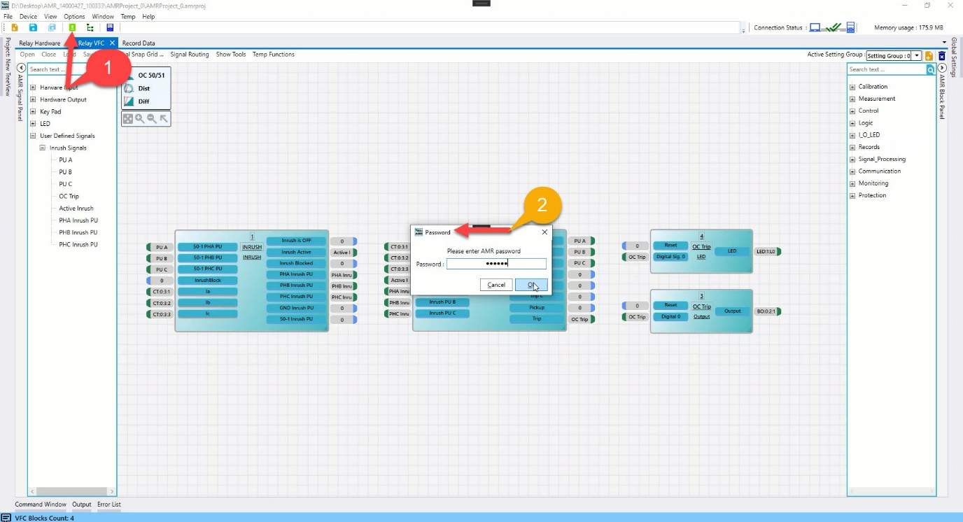 در صورتی که با نرم افزار رله کار می کنید میتوانید مطابق شماره گذاری انجام شده روی شکل زیر، با رفتن به زبانه Relay VFC و انتخاب فانکشن مورد نظر که در این آزمایش، OverCurrent است،یک تمپلیت پیش فرض را لود کنید. و تنظیمات مدنظر خود را با دابل کلیک کردن روی بلوک مربوطه، اعمال کنید.