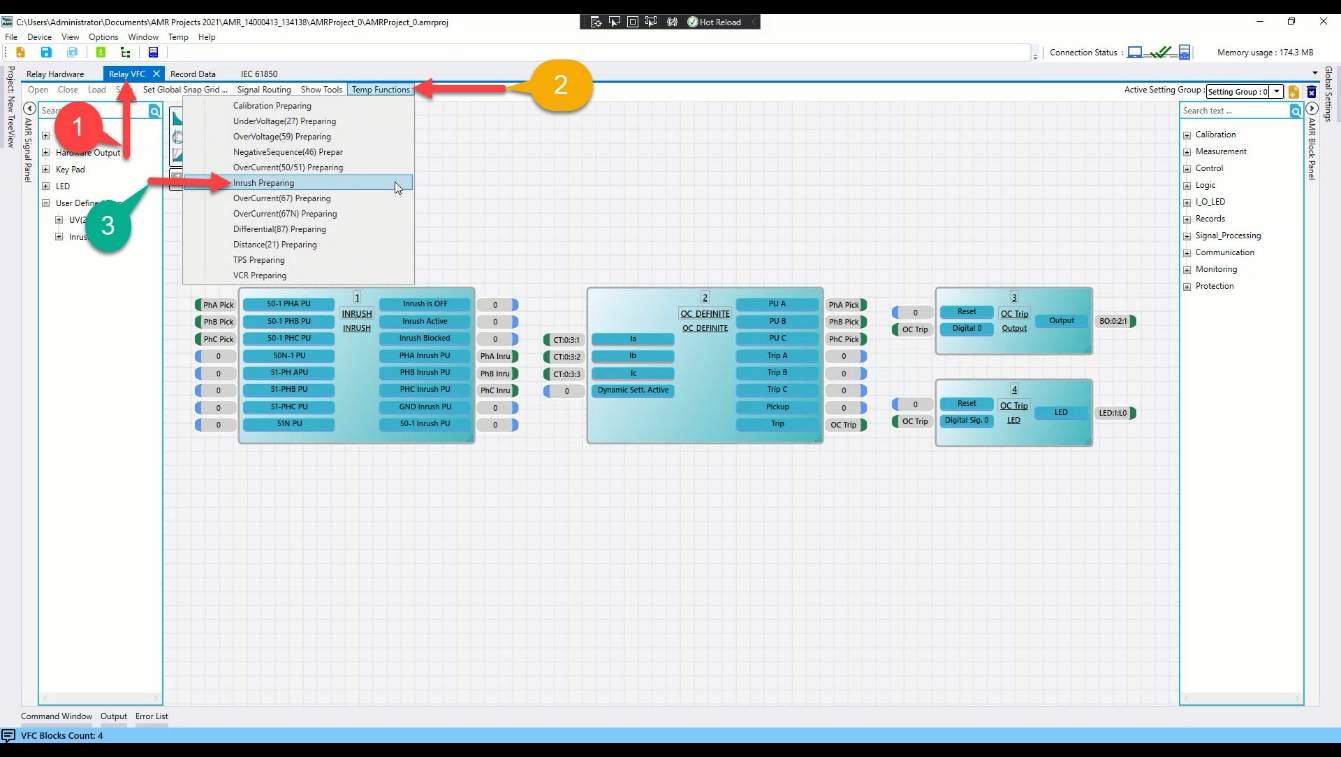 در صورتی که با نرم افزار رله کار می کنید میتوانید مطابق شماره گذاری انجام شده روی شکل پایین، با رفتن به زبانه Relay VFC و انتخاب فانکشن مورد نظر که در این آزمایش،Inrush Restraint است،یک تمپلیت پیش فرض را لود کنید. و تنظیمات مدنظر خود را با دابل کلیک کردن روی بلوک مربوطه، اعمال کنید.