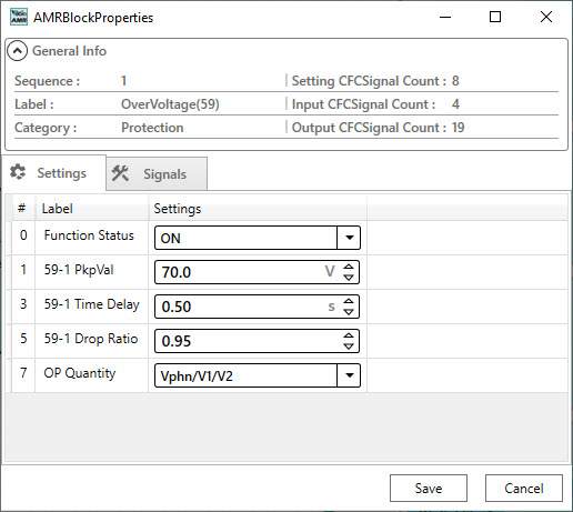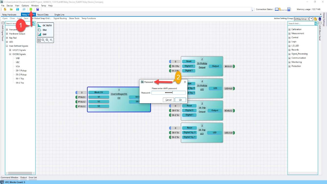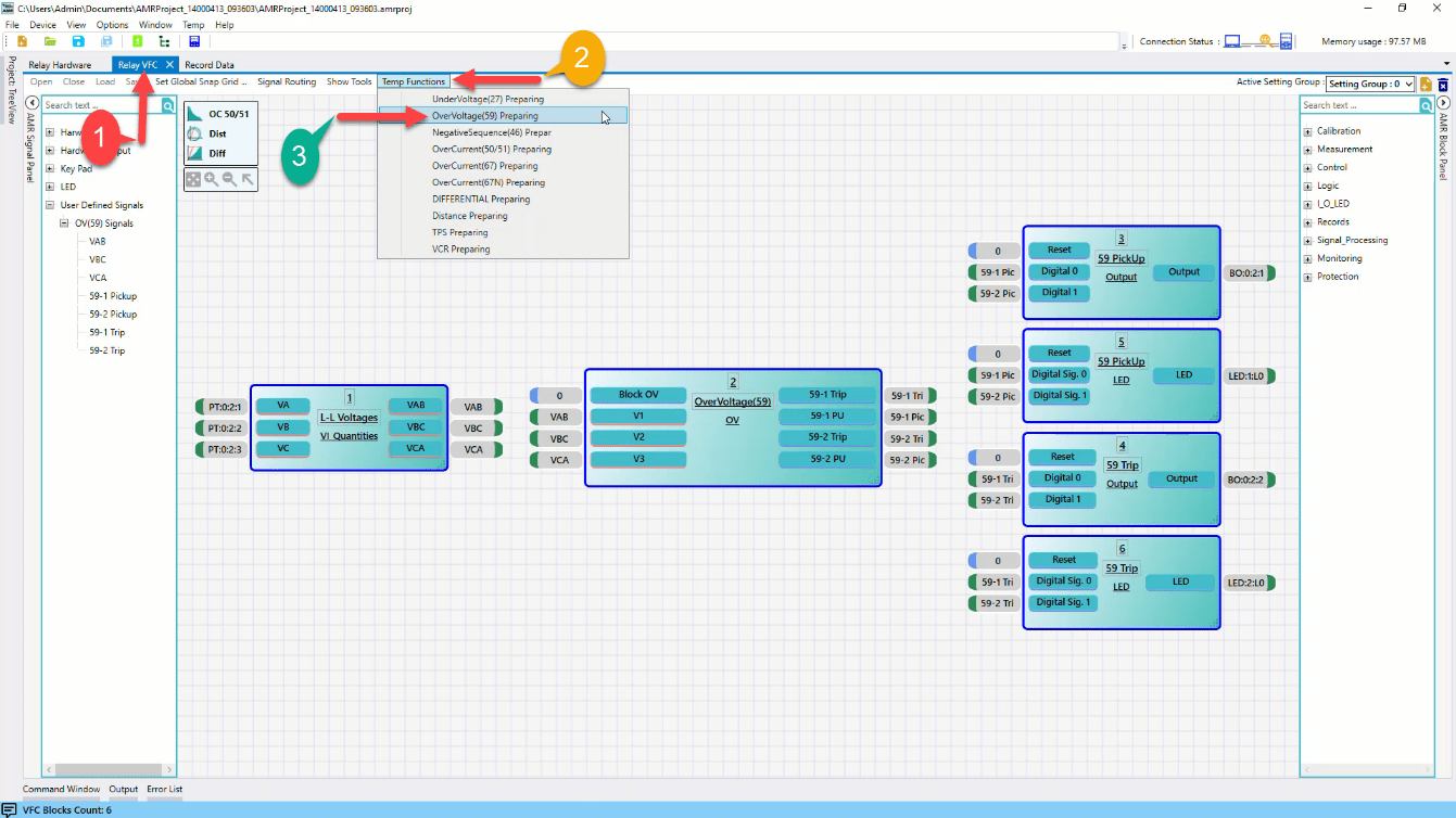 در صورتی که با نرم افزار رله کار می کنید میتوانید مطابق شماره گذاری انجام شده روی شکل زیر، با رفتن به زبانه Relay VFC و انتخاب فانکشن مورد نظر که در این آزمایش، OverVoltage است،یک تمپلیت پیش فرض را لود کنید. و تنظیمات مدنظر خود را با دابل کلیک کردن روی بلوک مربوطه، اعمال کنید.