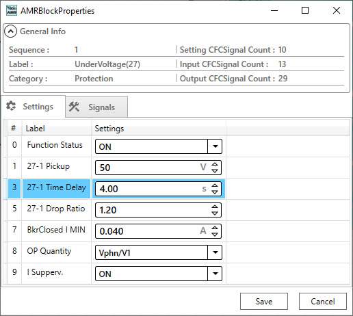 بین اعمال ولتاژ به هر فاز زمانی را برای ریست شدن تابع در نظر می گیریم(1 ثانیه) و برای فازهای سالم ولتاژ نامی (63.5 ولت) اعمال می شود (توجه شود چون تنظیم Current Supervision روی ON تنظیم شده است برای عملکرد فانکشن حتما باید جریان نیز تزریق گردد.).
