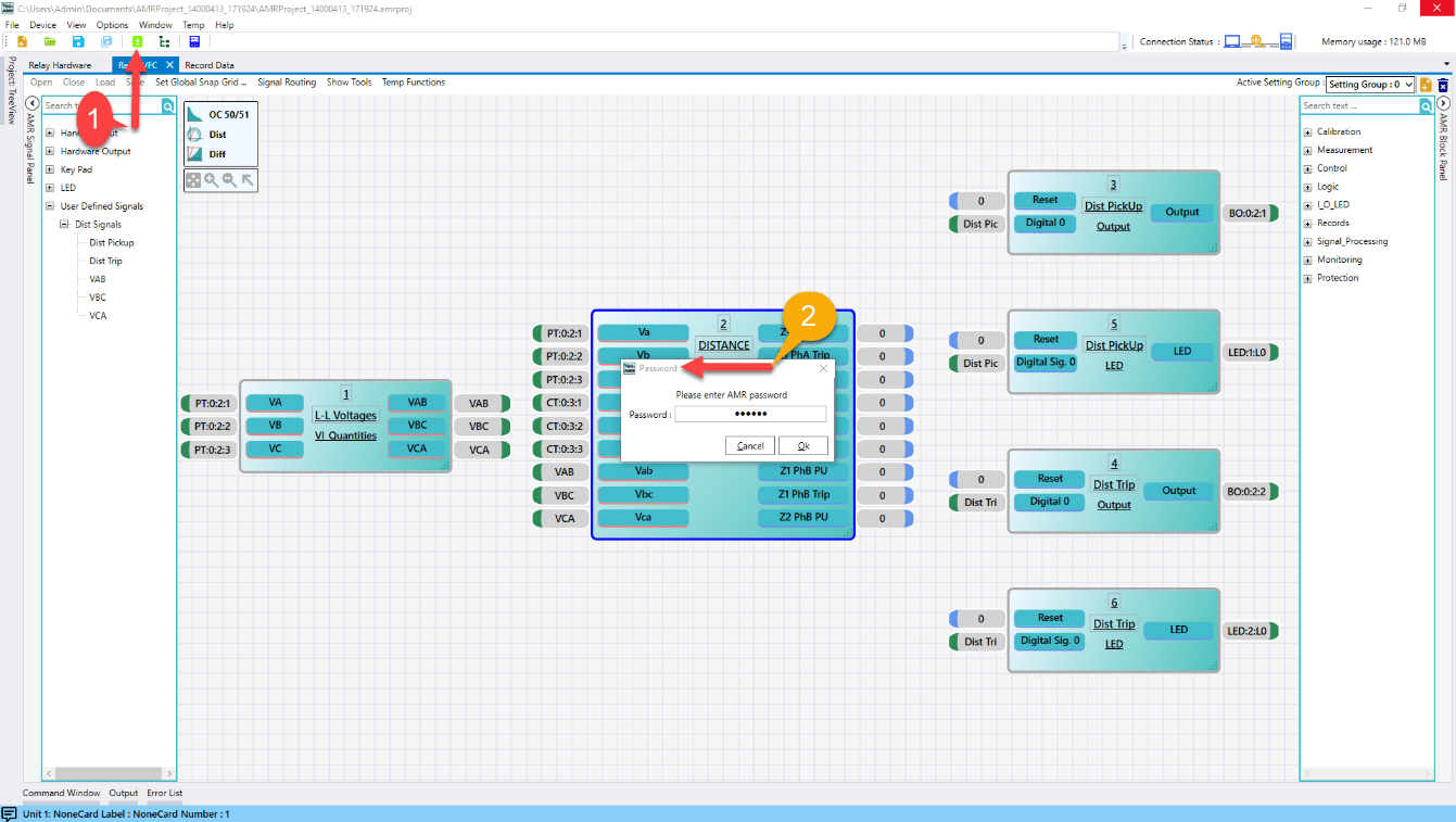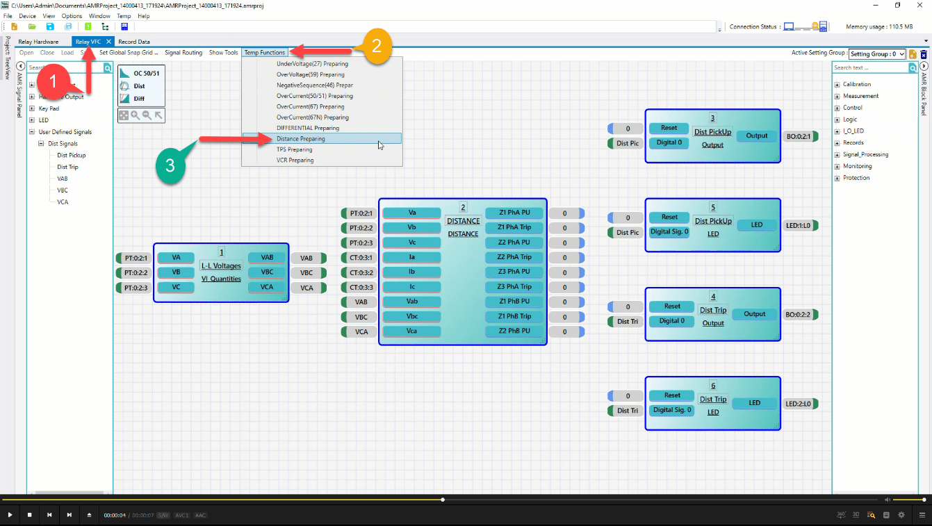 در صورتی که با نرم افزار رله کار می کنید میتوانید مطابق شماره گذاری انجام شده روی شکل زیر، با رفتن به زبانه Relay VFC و انتخاب فانکشن مورد نظر که در این آزمایش، Distance است،یک تمپلیت پیش فرض را لود کنید. و تنظیمات مدنظر خود را با دابل کلیک کردن روی بلوک مربوطه، اعمال کنید.
