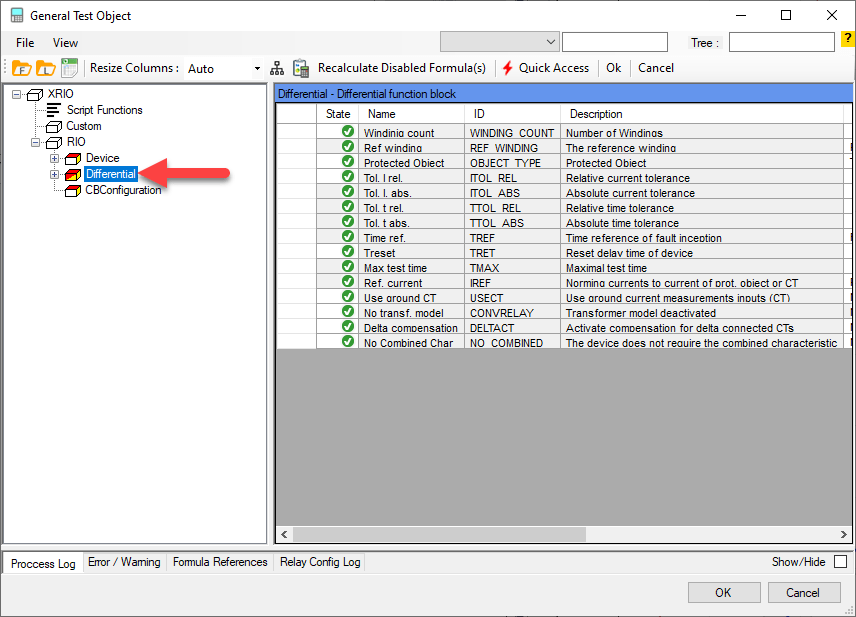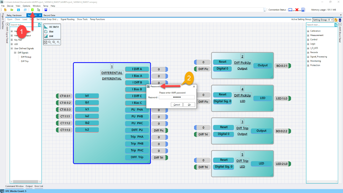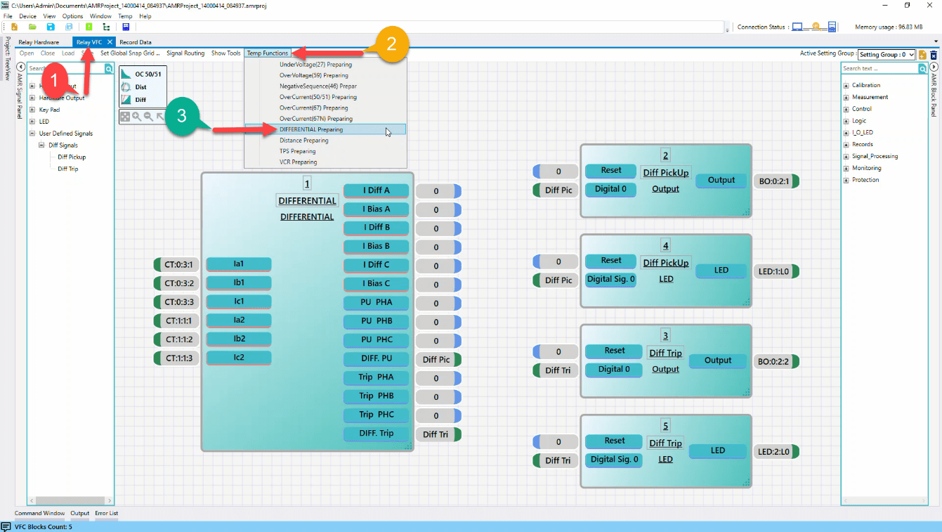 در صورتی که با نرم افزار رله کار می کنید میتوانید مطابق شماره گذاری انجام شده روی شکل زیر، با رفتن به زبانه Relay VFC و انتخاب فانکشن مورد نظر که در این آزمایش، Differential است،یک تمپلیت پیش فرض را لود کنید. و تنظیمات مدنظر خود را با دابل کلیک کردن روی بلوک مربوطه، اعمال کنید.