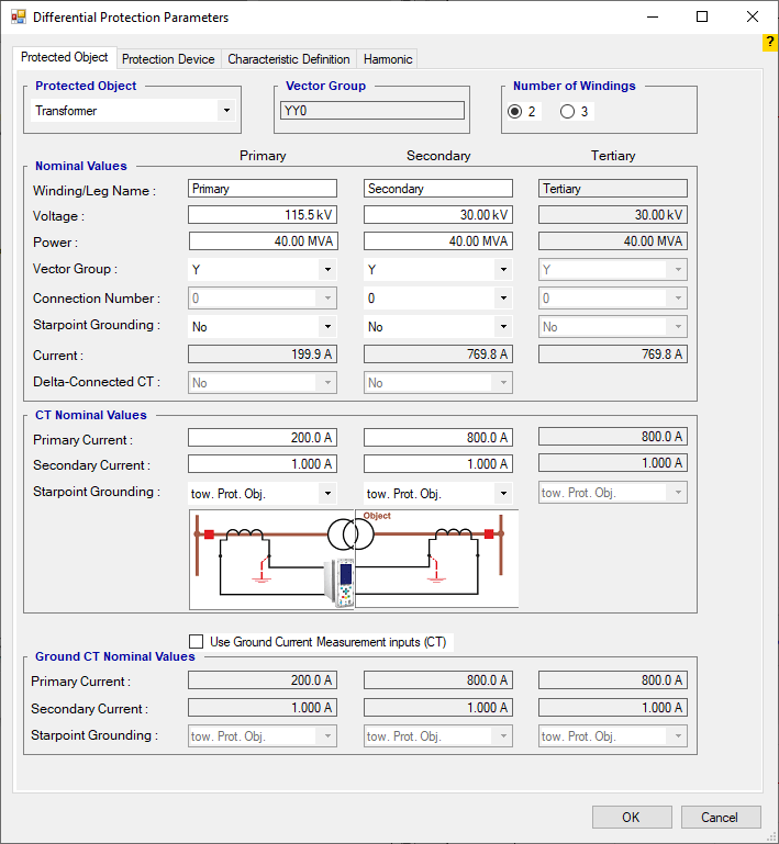 با توجه به شکل زیر، در تب Protcted Object اطلاعات ترانسفورماتور قدرت و ترانسفورماتور جریان را مطابق با تنظیم رله انجام دهید.