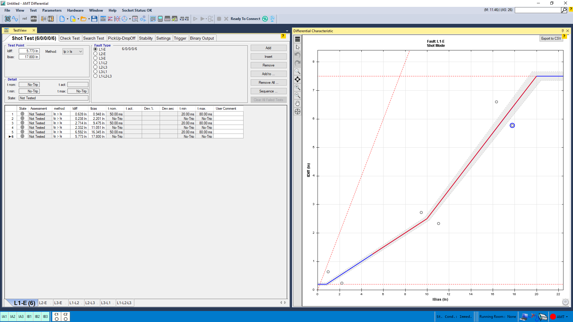 روش دیگر برای کشیدن "Check Line" این است که در پنجره " Differential Characteristic"، "Ctrl" و کلیک چپ ماوس را نگه داشته، ماوس را در جهتی که مایل هستید روی منحنی مشخصه بکشید. میبینید که اطلاعات "Check Line" ِ رسم شده در جدول خطوط "Check Test" نمایش داده میشود. پس از رسم "Check Line" نرمافزار محل تقاطع "Check Line" با خطوط تلورانس را به عنوان "Shot" تست و بر اساس عملکرد رله ارزیابی میکند