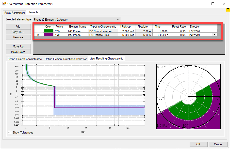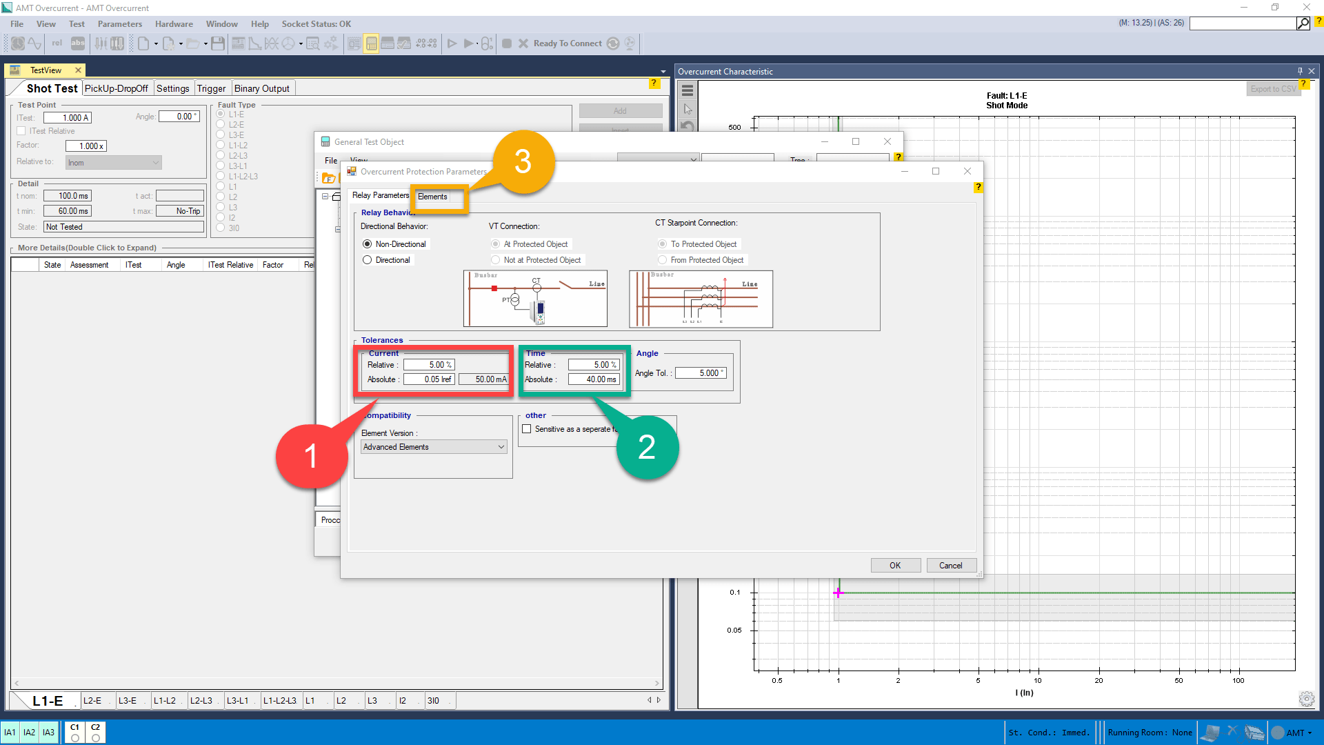 در بخش "Tolerances"، تلرانس های جریانی، تلرانسهای زمانی و تلرانسهای زاویهای در رلههای "Directional"، تنظیم میشود. برای تنظیم تلرانس جریانی باید در فیلد "Relative"، تلرانس مد نظر به صورت درصدی از جریان تست وارد شود، میبینید به طور پیشفرض این تلرانس روی 5 درصد تنطیم شده است. همچنین در قسمت "Absolute"، میتوان این تلرانس را برحسب ضریبی از جریان نامی "CT" در این فیلد تنظیم و مقدار واقعی آن را در فیلد جلوی آن مشاهد کرد. در قسمت 3 در "Relay behavior"، تنظیمات مربوط به جهت حفاظت رله، چگونگی قرار گرفتن "VT"ها، و نحوه سربندی "CT" ها مشخص میشود. چون در اینجا رله مد نظر ما " directional" میباشد، در این پنجره " directional" انتخاب میشود. توجه کنید تنظیمات مربوط به "VT Connection" و "CT Connection" فقط در حالت "Directional" فعال بوده و در رلههای "Non-directional"، این گزینه ها غیرفعال هستند. نرمافزار تلرانس را بیشترین مقدار را درنظر میگیرد. در قسمت "Time" هم تلرانس های زمانی به دو صورت درصدی و واقعی تنظیم شده و تلرانس زاویهای آن هم در بخش "Angle" تنظیم میشود. سپس وارد تب Elements شوید. سپس تنظیمات مانند شکل زیر انجام شود.
