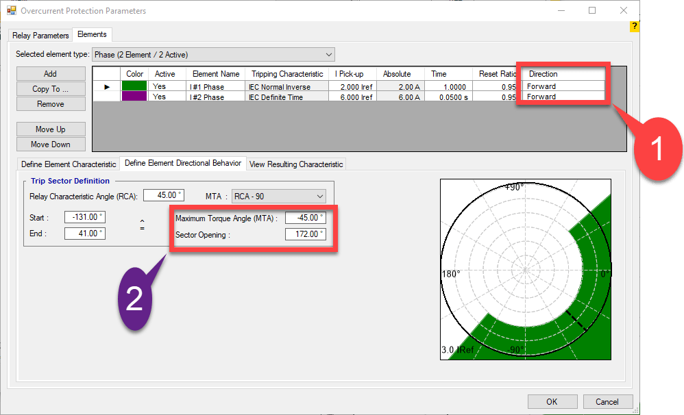 تست اضافه جریان جهتی نیاز به تنظیم دو پارامتر Maximum torque angle و Sector operation میباشد. برای انجام اینکار از پنجره Overcurrent وارد تب Element شده، سپس قسمت Directional را روی Forward قرار میدهیم. در ادامه وارد زیر تب Define Element Directional Behavior شده و پارامترهای Maximum torque angle و Sector operation را به ترتیب برابر -45 و 172 قرار دهید. این کار را برای هر دو المان Normal Inverse و Definite Time انجام دهید.