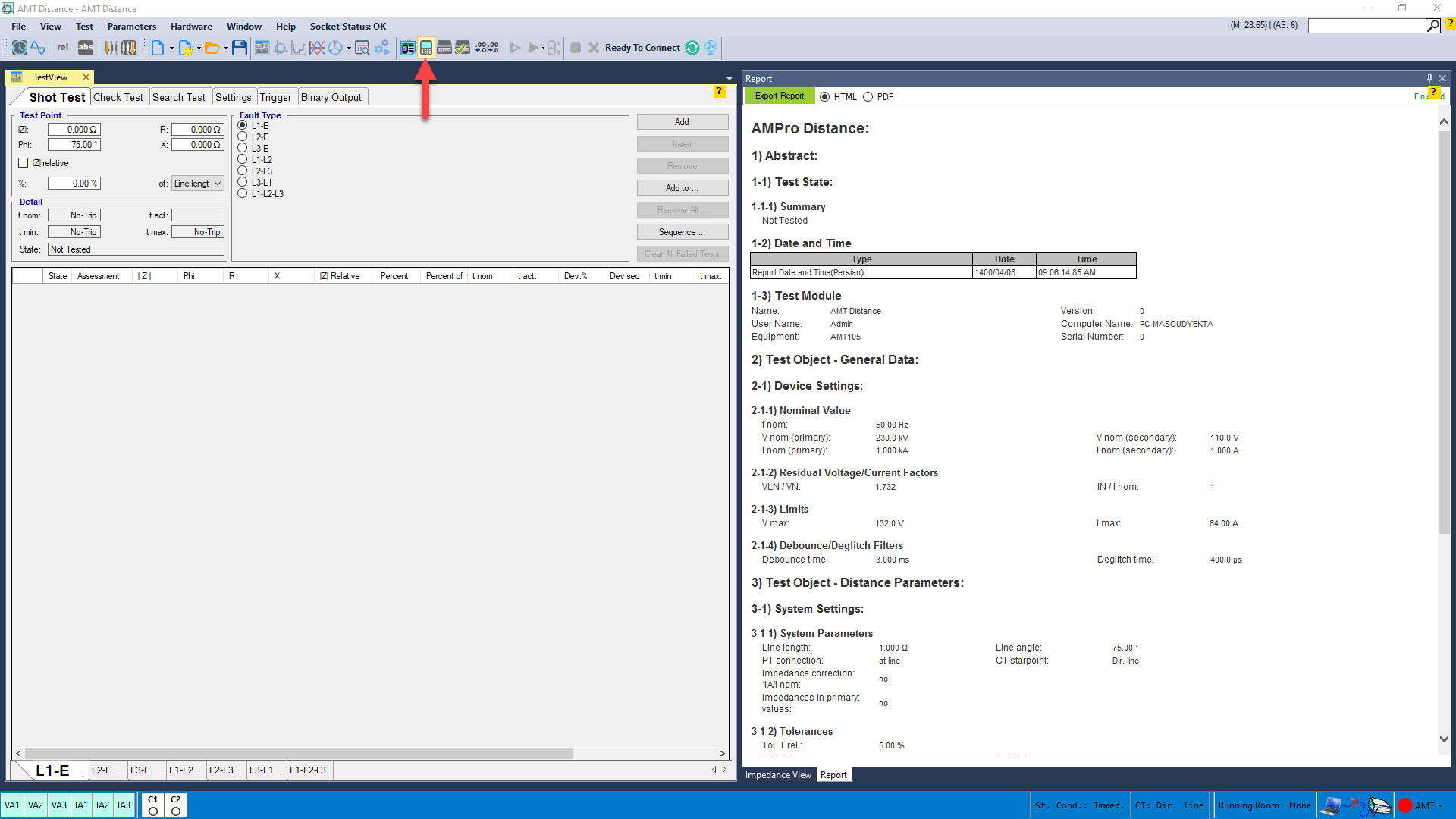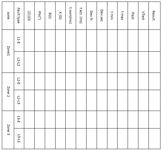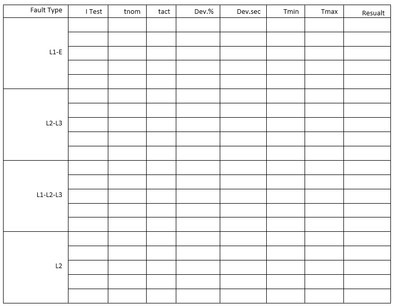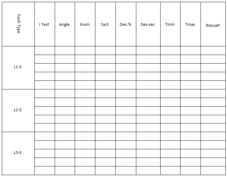 در این مرحله با توجه به Error! Reference source not found. تعدادی شات تست در خطاهای L1-E و L2-L3 و L1-L2-L3 و L2 در جریانهای 1.5 , 2.5 , 4.5 , 5.5 , 6.5 A وارد کنید و در اطلاعات نقاط تست شده را مطابق با جدول زیر ثبت کنید. پارامترهای ارائه شده در این جدول به صورت زیر تعریف میشوند.