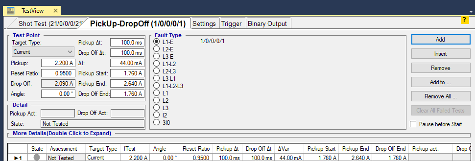 در این مرحله به بررسی Pickup/DropOff دامنه جریان پرداخته میشود. این تست برای هرکدام از خطاهای L1-E , L2-E , L3-E باید بصورت جداگانه انجام شود. اطلاعات مربوط به این تست را مطابق با شکل زیر وارد کرده و نتایج تست را در جدول زیر وارد نمایید. توجه: با اینکه جریان Pickup در تنظیمات رله 2 آمپر است، در این تست جریان 2.2 آمپر برای بررسی Pickup در نظر گرفته شده است. دلیل این است که رنج عملکرد منحنی ها از 1.1 جریان تنظیمی در رله شروع میشود. بنابراین با تنظیم جریان Pickup رله روی 2 آمپر، انتظار میرود رله روی 1.1*2=2.2 آمپر Pickup کند.