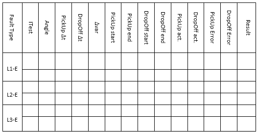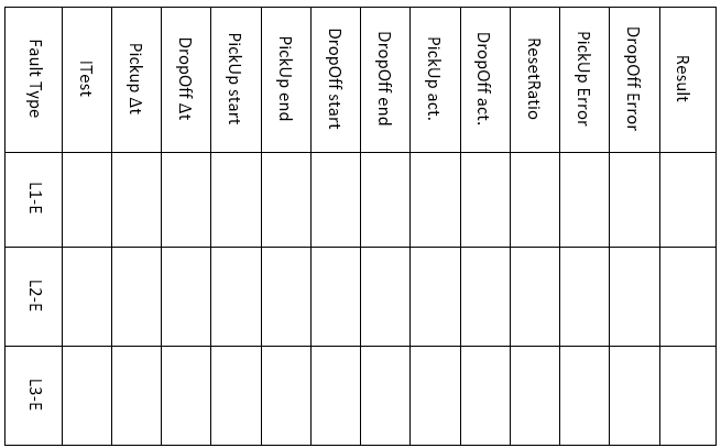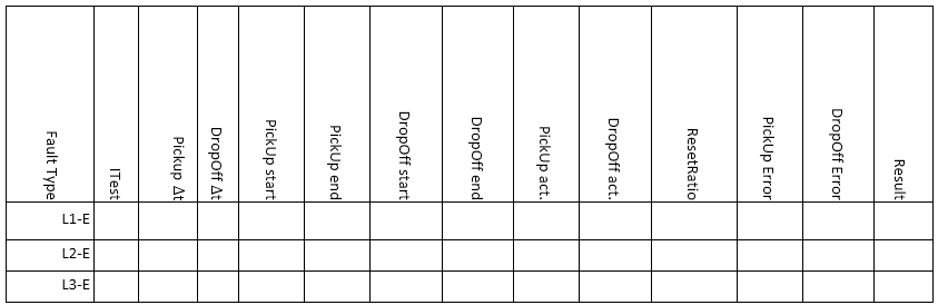 در این مرحله با توجه به شکل زیر، تست Pickup-Drop انجام میشود. این تست را برای خطاهای L1-E , L2-E , L3-E اجرا نمایید و نتایج را در جدول زیر ثبت نمایید. پارامترهای ارائه شده در این جدول به صورت زیر تعریف میشوند.