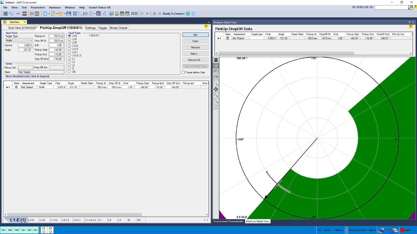 این تست برای هر المان جریانزیاد جهتی و برای هر فاز بصورت جداگانه انجام میشود. بسته به اینکه تنظیم رله روی ناحیه Forward/Reverse است و مقدار تنظیمی Torqe Angle چقدر است، بایستی زاویههای محدودهی Forward/Reverse محاسبه شود و در مراحل انجام تست از آنها استفاده شود. برای بدست آوردن ناحیه عملکرد رله بایستی کتابچه راهنمای رلهی مورد نظر را مد نظر قرار داد. در این تست با توجه به تنظیمات رله، محدوده عملکرد رله بین زوایای 131- درجه تا 41+ درجه میباشد. باید هر دو مرز ناحیه جهتدار چک شود. این عمل باید برای هر دو المان زمان معکوس و زمان ثابت تست شود. در این آزمایش تنها محدوده عملکرد منحنی زمانمعکوس بررسی شود. در پنجره TestView وارد تب Pick Up-DropOff شده و Target Type را روی گزینه Angle قرار دهید. برای بررسی مرز 41+ درجه، اطلاعات را مشابه با شکل زیر وارد نموده و در خطاهای L1E، L2E و L3E اضافه کنید.