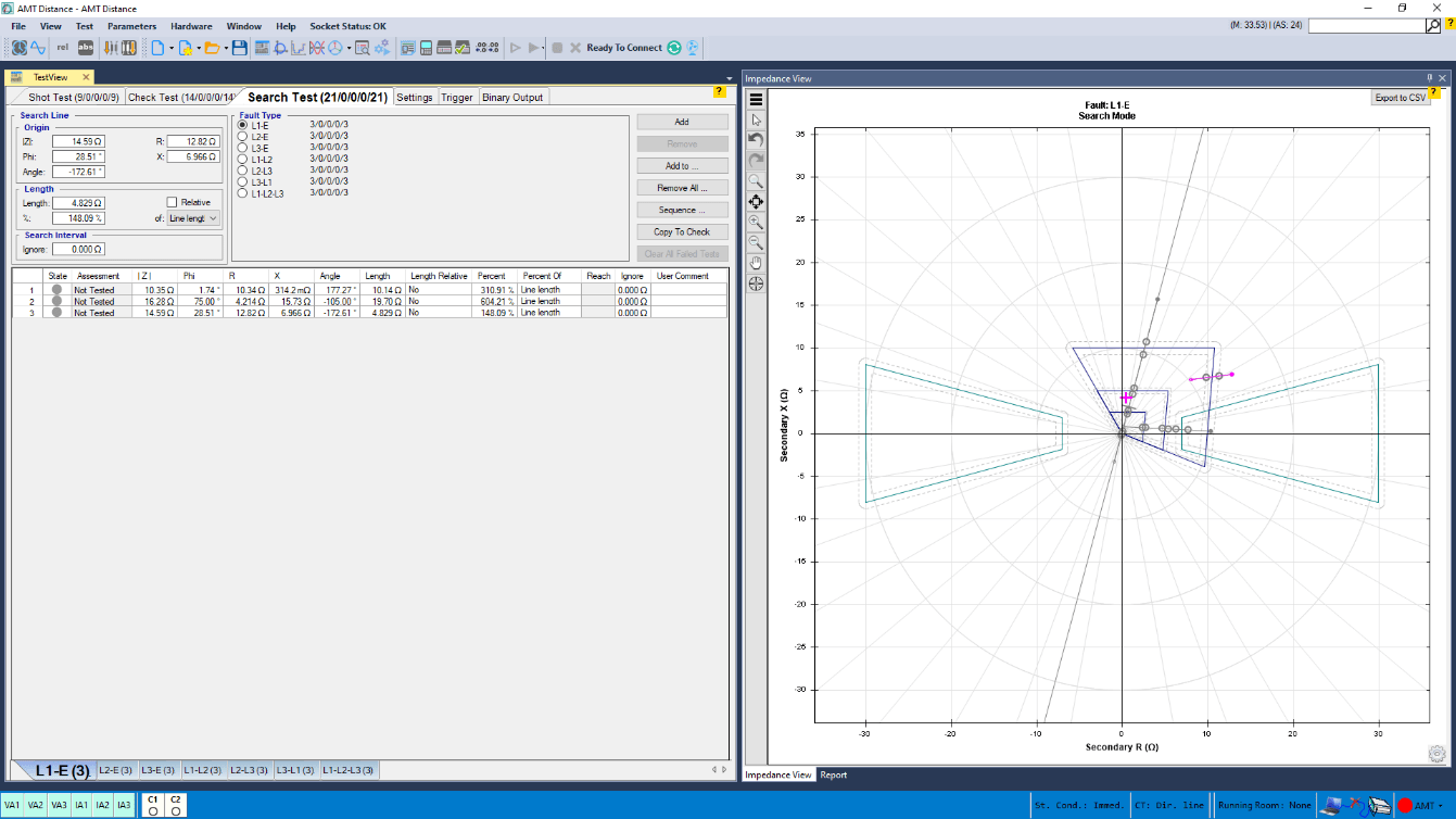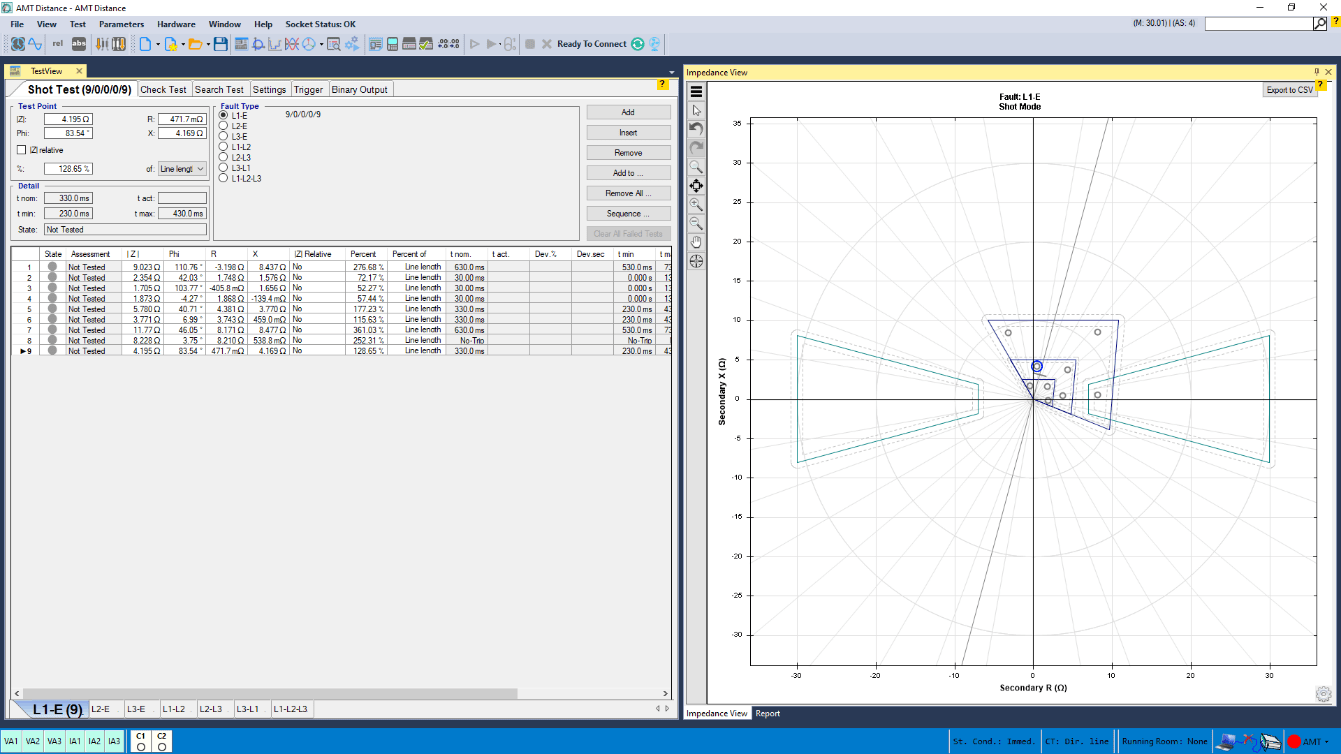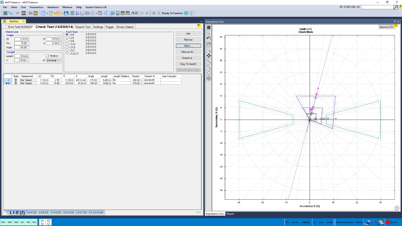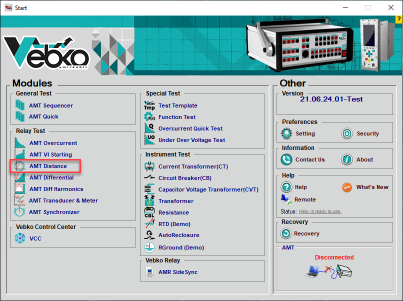 در روم "AMT Distance" تست مشخصه امپدانسی رلهها انجام میشود. مهمترین کاربرد این روم تست رلههای دیستانس و "Under Excitation" میباشد. رلههای دیستانس برای حفاظت خطوط انتقال و "Under Excitation" برای حفاظت ژنراتورها مورد استفاده قرار میگیرند.