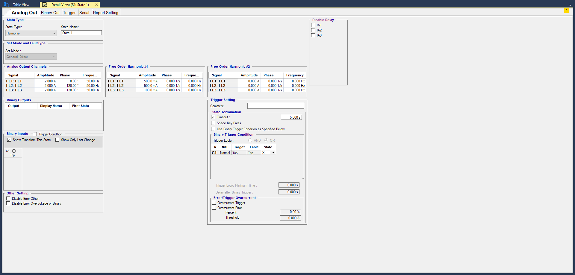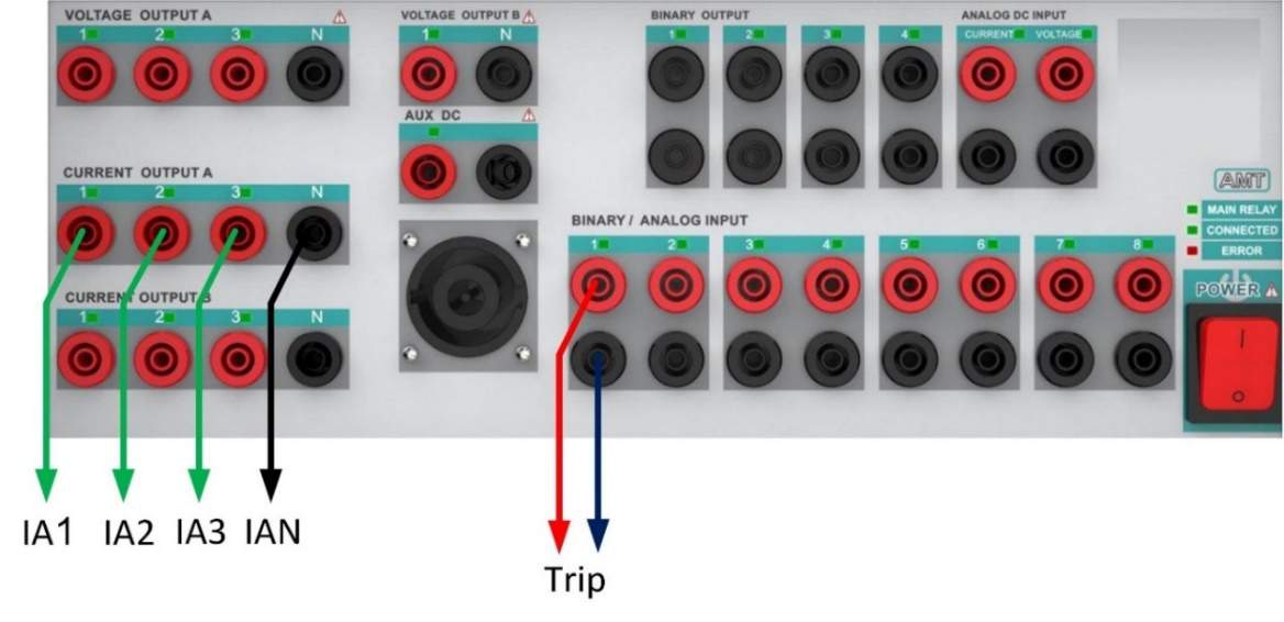 برای تست Inrush Restraint به یک مجموعه جریان سه فاز به همراه کنتاکت خروجی Trip رله برای ارزیابی نیاز میباشد. در شکل فوق عبارات IA1، IA2 و IA3 یک مجموعه جریانی سهفاز میباشد. کنتاکت ورودی Trip، خروجی رله برای ارزیابی تستهای زمانی میباشد.