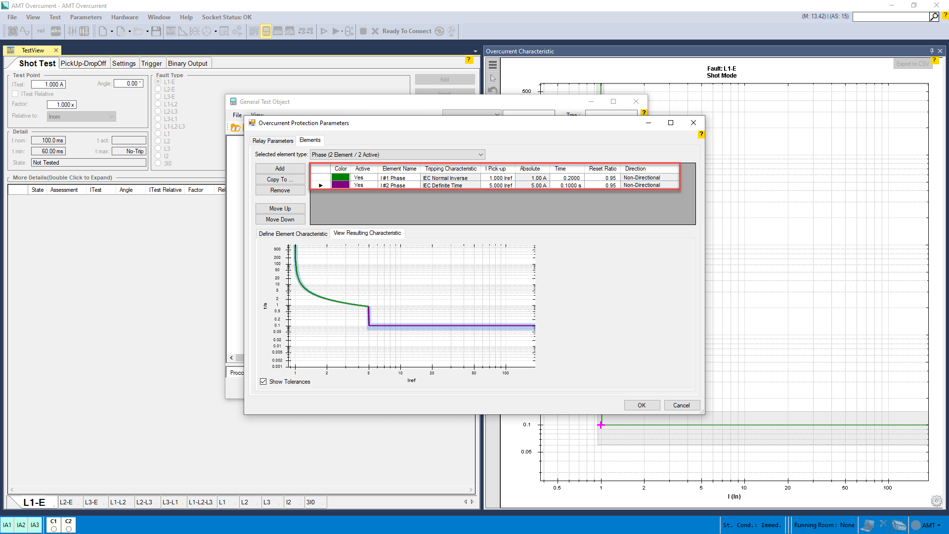 در مرحله بعد با توجه به شکل زیر تنظیماتی که در رله وارد شده را به نرمافزار تستر اعمال نمایید. در اینجا یک منحنی زمان معکوس از نوع IEC Normal Inverse با تنظیم جریانی 1 آمپر و تنظیم زمانی 0.2 ثانیه به همراه یک منحنی IEC Definite Time (زمان ثابت) با تنظیم جریانی 5 آمپر و تنظیم زمانی 0.1 آمپر را وارد میشود.
