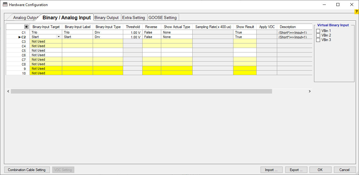 برای انجام تست Pickup/Drop در نرمافزار دستگاه تست رله، ابتدا باید وارد روم Sequencer شوید. در این روم از قسمتHardware Configuration خروجیهای ولتاژی و جریانی را فعال نمایید. همچنین با توجه به شکل زیر، ورودیهای دستگاه تستر را در تب Binary Input به ترتیب Trip و Start تعریف کنید.
