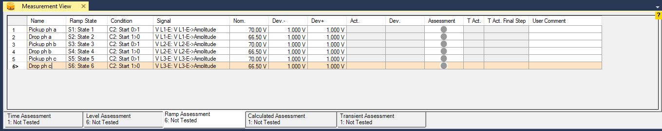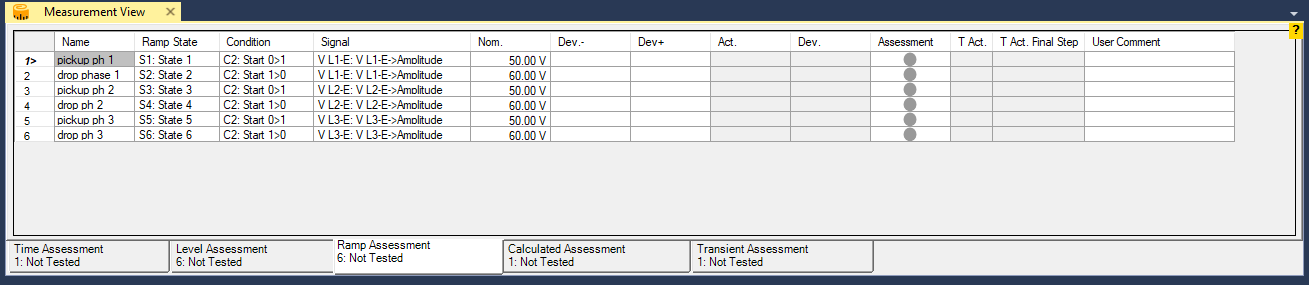 برای ارزیابی عملکرد رله با توجه به ولتاژ اعمالی در Stateهای مختلف، در Measurement View در قسمت Ramp Assessment تنظیمات را بر اساس شکل زیر انجام دهید. با اجرای تست ولتاژهای Pickup و Drop در هر فاز مشخص میگردد.
