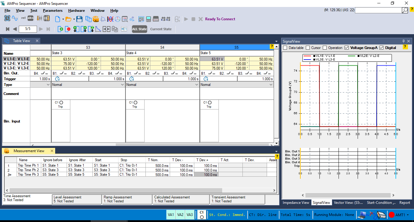 در Measurement View، در قسمت Time Assessmentزمان تغییر وضعیت سیگنال تریپ از 0 به 1در واقع Trip Time فانکشن کاهشولتاژ میباشد. یک نمونه از Time Assessment برای فاز اول در شکل اول مشاهده میشود. در شکل دوم نمای کلی صفحه تست برای ارزیابی زمان عملکرد فانکشن کاهش ولتاژ مشاهده میگردد.