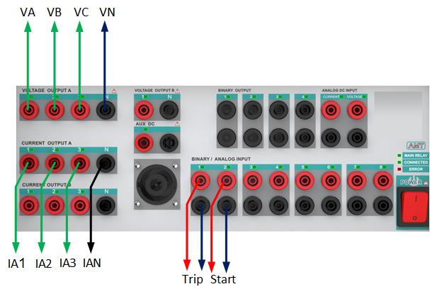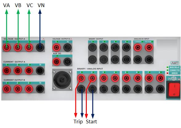 برای تست فانکشن دیستانس به یک مجموعه ولتاژ و جریان سه فاز به همراه یک کنتاکت خروجی رله برای ارزیابیها نیاز میباشد. در شکل زیر عبارات VB,VA و VC یک مجموعه ولتاژ سهفاز میباشد. همچنین عبارات IA1، IA2 و IA3 یک مجموعه جریانی سهفاز میباشد. کنتاکت ورودی Trip، خروجی رله برای ارزیابی تستهای زمانی است.