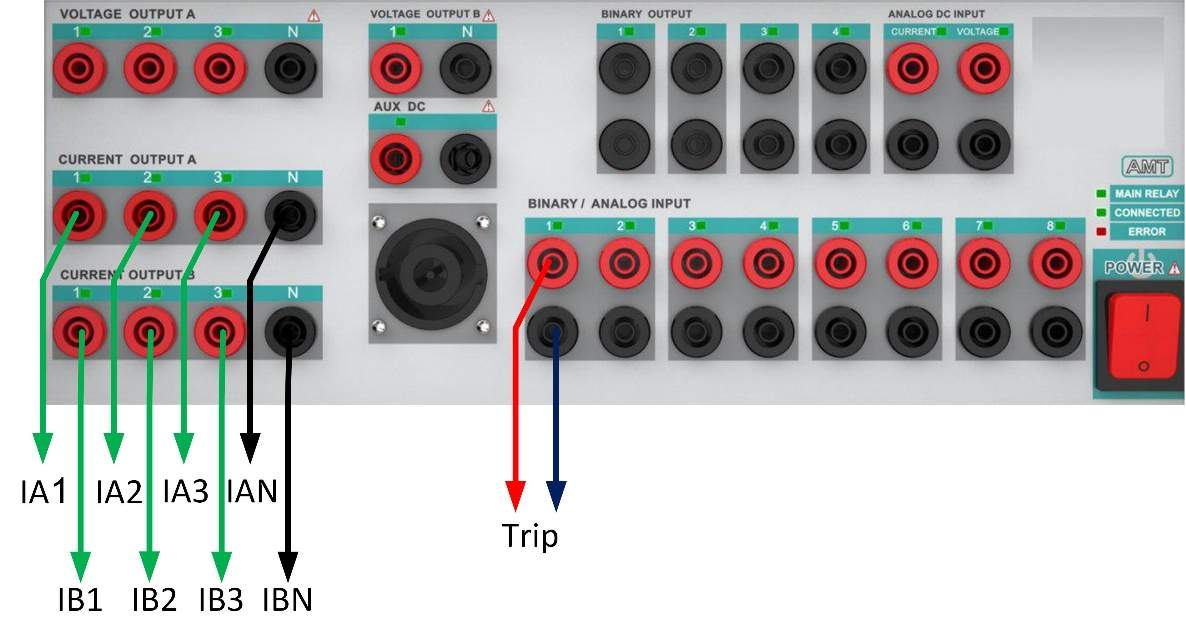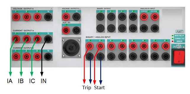 برای تست فانکشن اضافه جریان، به یک مجموعه جریان سه فاز به همراه کنتاکت های خروجی "Start(Pickup)" و "Trip" رله، برای ارزیابی نیاز میباشد. در شکل اول عبارات IA، IB و IC یک مجموعه جریانی سهفاز میباشد. سیمهای جریانی را بدرستی به رله متصل نمایید.